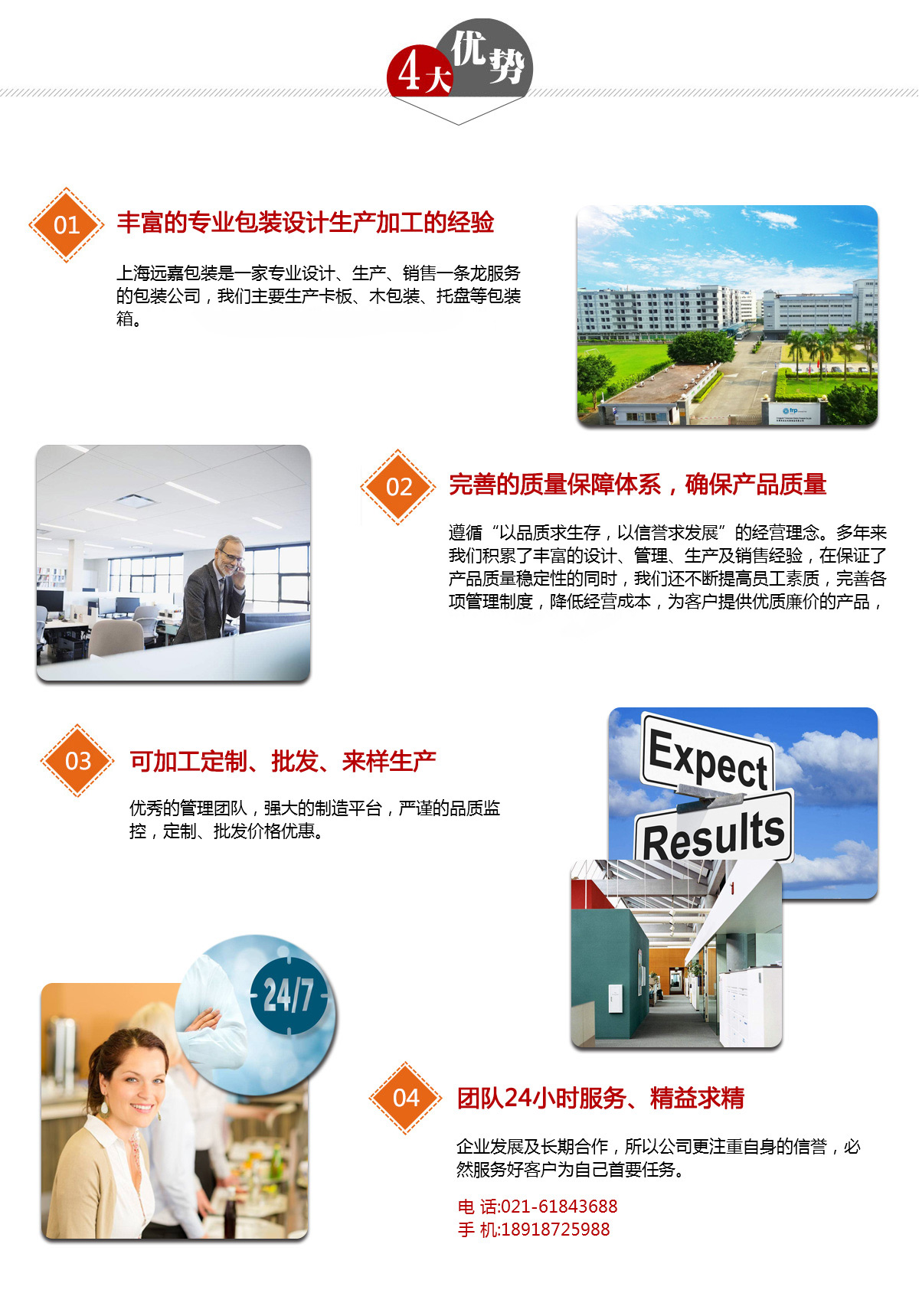 上海遠(yuǎn)嘉包裝技術(shù)有限公司擁有數(shù)年包裝設(shè)計(jì)生產(chǎn)經(jīng)驗(yàn)。為客戶設(shè)計(jì)定制各類(lèi)出口包裝箱,木箱包裝,免熏蒸包裝箱,鋼帶箱,扣件包裝箱,花格箱,大型設(shè)備包裝箱,實(shí)木熏蒸包裝箱,木托盤(pán),熏蒸及免熏蒸托盤(pán),熱縮膜包裝等。
